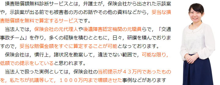 少しでも多くの方が適切な賠償金を獲得できるよう、当法人では損害賠償額を無料で診断するサービスを行っております。